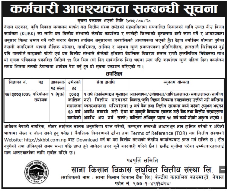 Vacancy Announcement From Sana Kisan Bikas Laghubitta Bittiyasanstha
